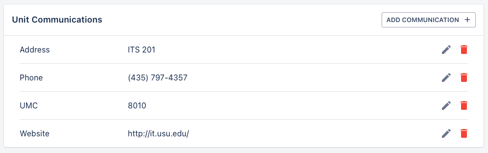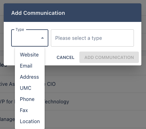 Adding a communication type to a unit requires selecting the add Communication button, selecting a communication type, and entering the value. Only the specified communication types listed in the drop down can be used.