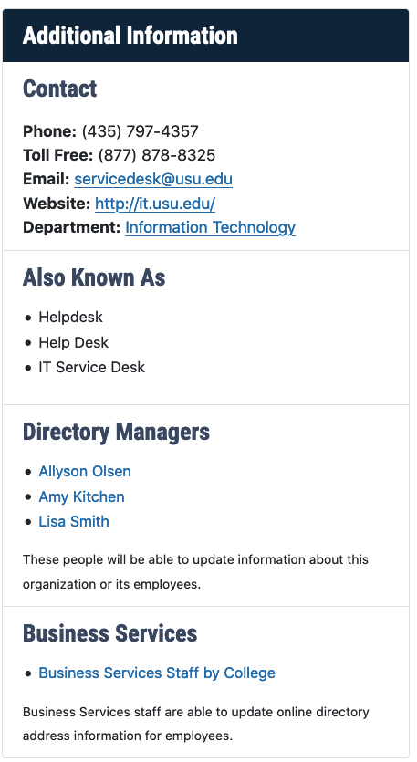 Departmental changes in the USU Directory must be made by the directory administrator for your respective department or organization. (To view the directory manager for your division, log in at directory.usu.edu and navigate to the division and view along the right-hand side)