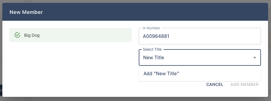 This page allows you to add an A number to a title. Inside the Add Member interface, you can click on the title drop down and select a title or type a new title name. One of the options in the drop down will be 'Add "{title}"'. Select this option if you want to add a new title that will be associated with the new member.