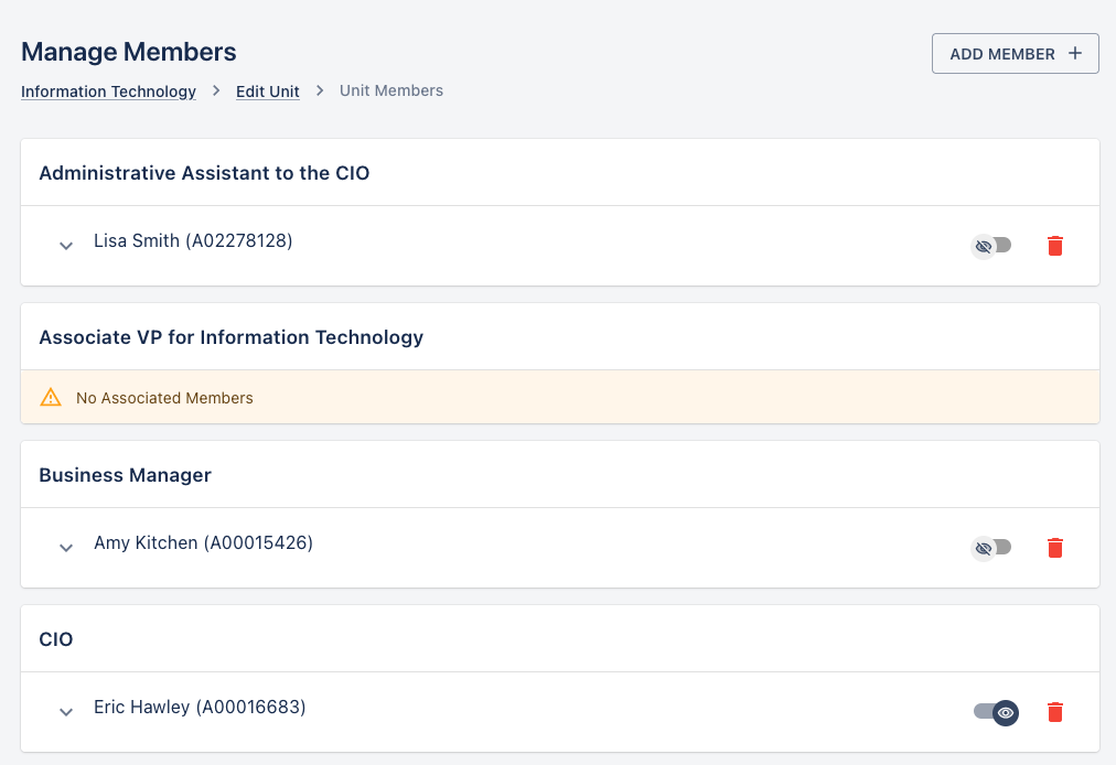 A member's visibility can be toggled with the switch next to their name. Toggling the visibility of a member will toggle their visibility across all of their positions.