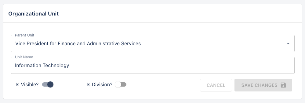 The general information about a department can be changed to alter the parent, name, and mark if the unit is a division. Be sure to save changes after you have edited one of these fields.