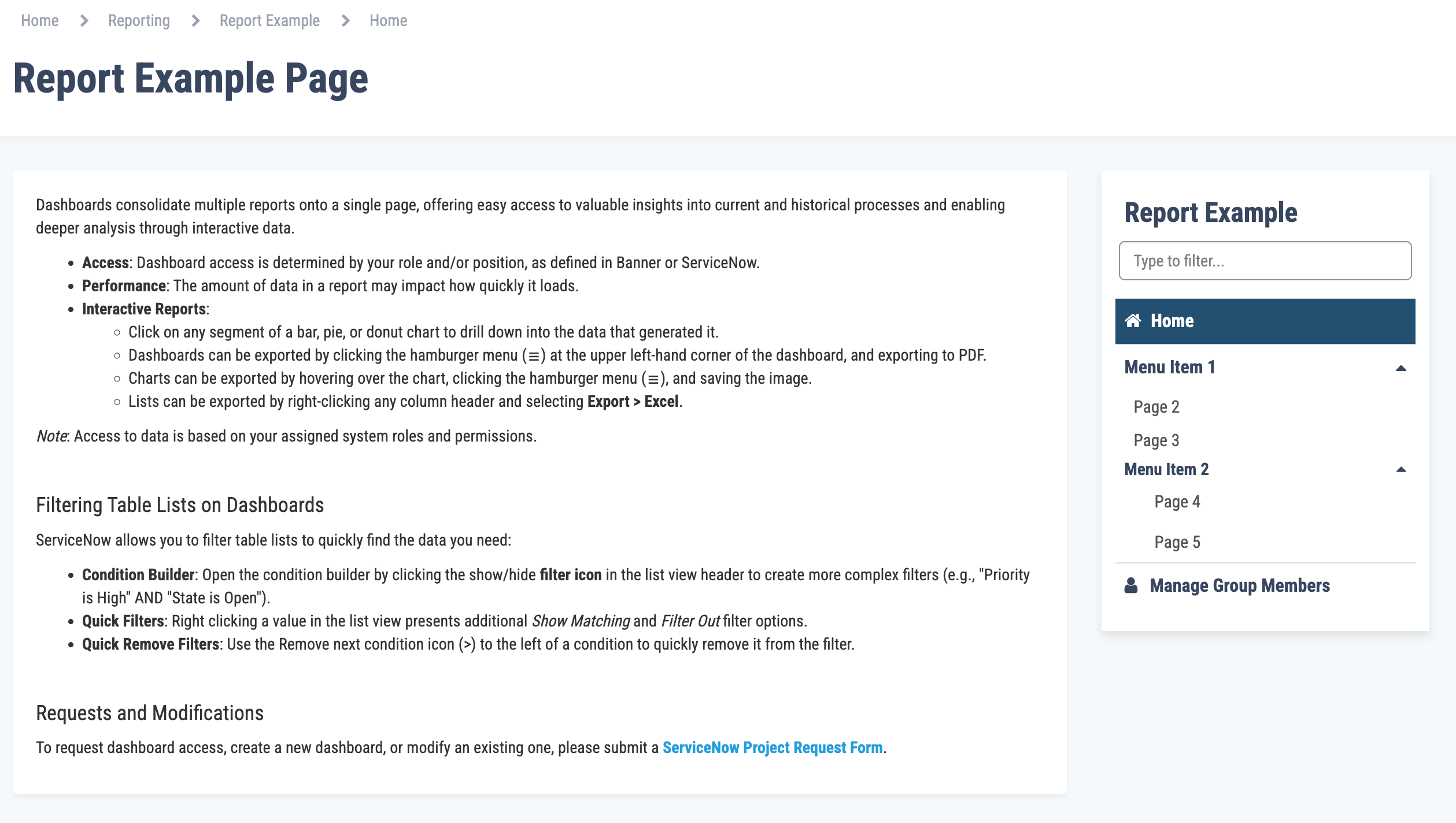 - Filtering: Use the filter tool to search for specific reports and dashboards.